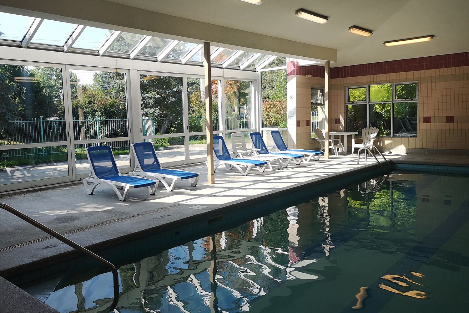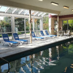 - Indoor swimming pool in glass cabana and lounge area